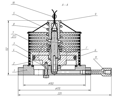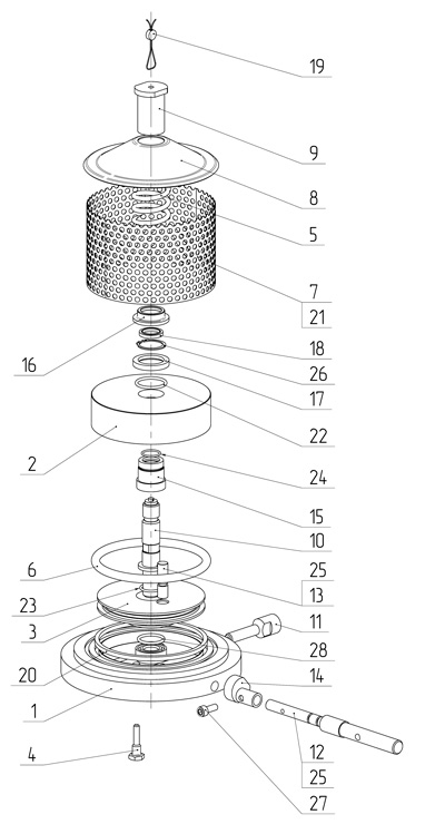 1 - основание; 2 - цилиндр; 3 - направляющий поршень; 4 - винт стопорной; 5 - пружина; 6 - кольцо поршневое; 7 - сетка; 8 - крышка; 9 - гайка; 10 - ось, установленная в поршне; 11 - штуцер, служащий для подвода воздуха; 12 - ручной дублер, установленный в основании; 13 - толкатель; 14 - эксцентрик; 15 - втулка; 16 - шайба; 17 - кольцо; 18 - манжета; 19 - пломба; 20, 22, 23, 24, 25, 28 - кольца уплотнительные; 21 - сетка латунная; 26 - кольцо стопорное; 27 - винт.