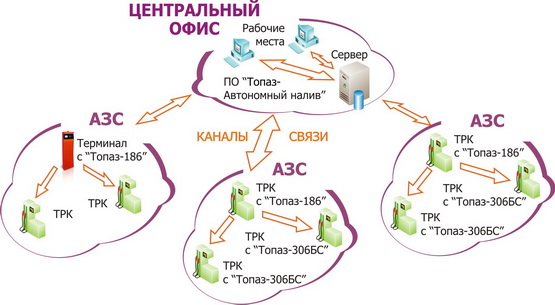 Программно-аппаратный комплекс «Топаз-Автоном налив» поддерживает работу как с однорукавными, так и с многорукавными ТРК, а также с группой ТРК и сетью АЗС.